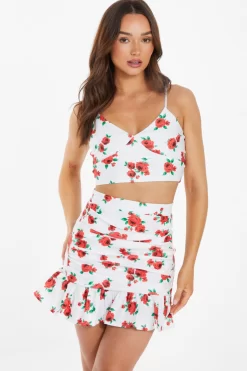 White Floral Ruched Mini Skirt